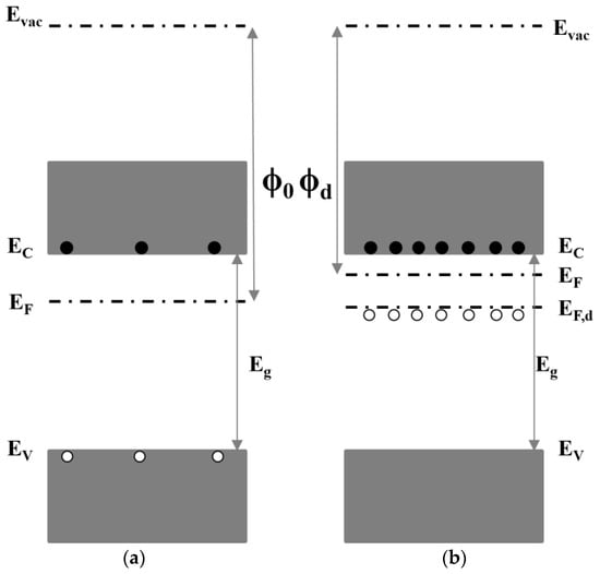 Dopant-free materials usually have large band gaps and are capable of providing carrier selective contacts, enabling the separation of electrons and holes. Such separation can be achieved by utilizing materials with sufficiently high or low work functions (WF) on either side of a crystalline silicon wafer []. Hole selective layer (HSL) requires a WF higher than 5.5 eV, while ESL requires a WF lower than 4 eV [].