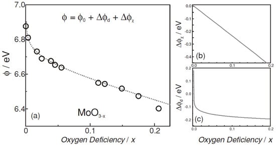 (a) Plot of oxygen deficiency (vacancy) and work function (ϕ). ϕ0 is the work function of MoO3, and the work function of MoOx decreases with the increase of oxygen deficiency, which results from (b) low electronegative cation, causing work function change (Δϕχ) and (c) donor state, causing work function change (Δϕd) [].