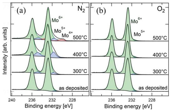 X-rays photoelectron spectroscopic (XPS) spectra of Mo 3d, showing the effect on annealing temperature and ambient: (a) N2, (b) O2. Reprinted with permission from []. Copyright 2014 American Chemical Society.