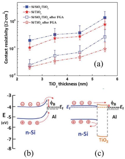 (a) The contact resistivity dependence on the thickness of the TiO2 layer before and after forming gas annealing (FGA). The Si/TiO2 interface exhibits good passivation and relatively low contact resistivity. (b) and (c) Band gap alignments with and without TiOx interlayer between the silicon wafer and Al []. A minus sign in the circle represents the electron, and a plus sign represents the hole. With the insertion of the TiOx layer, the decreased ϕB could favor the electrons to be collected and holes to be blocked, showing the electron-selective property of TiO2.