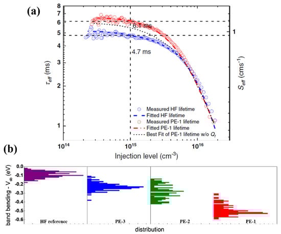 (a) The τeff and the corresponding effective surface recombination rate (Seff) of HF and PE-1 samples as a function of injection level. (b) The band bending of the HF and PE samples []. The difference between the PE samples is the hydrogen flow rate and pressure, all other parameters are constant.