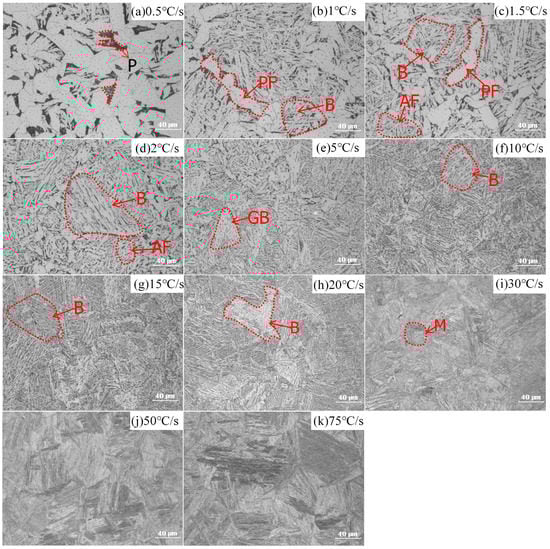 | Cooling Rate °C/s | Steel Grade | F % | P % | PF % | B % | AF % | M % |