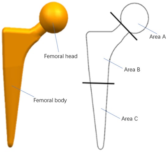 The prosthetic femoral stem comprises two parts: the femoral head and the femoral body. The femoral head material is a mostly non-metallic composite material with a hard surface and scratch resistance and its shape is primarily spherical or oval. The neck of the femur has a smooth, solid surface and is usually integrated with the main shaft of the femur. We focus on the structural design of the Area B femoral stem. The structure of the femoral stem is shown in Figure 1.
