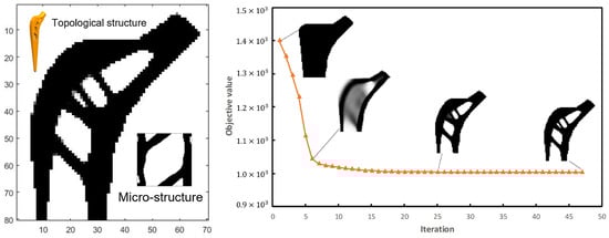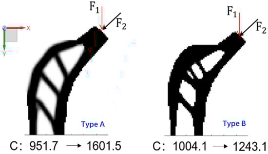 The B region of the femur stem is taken as the design domain and the four-node element discrete structure is adopted in the two-dimensional space. The discrete structure of the design domain is 2928 elements, the element side length is set to 1, the material’s Poisson’s ratio is , the material’s elastic modulus is , the penalty parameter is , the filter radius and the X and Y directions of the bottom node are constrained. A concentrated load along with the Y axis is applied at the midpoint of the femoral neck end face, as shown in Figure 2.