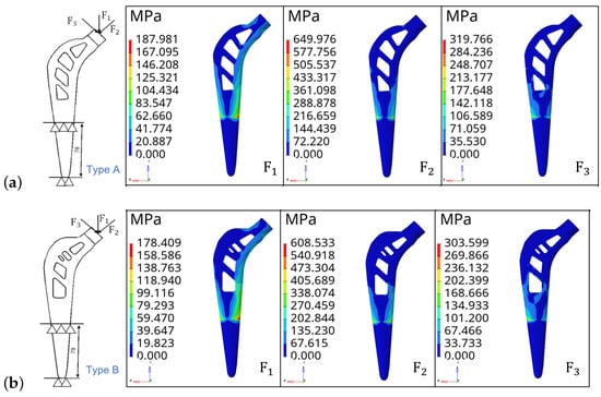 Figure 6 shows that for type A femoral stem, the maximum stresses are MPa, MPa and MPa when the load forces are , and , respectively. The maximum stresses for type B femoral stem are MPa, MPa and MPa when the load forces are , and , respectively. It can be seen that the maximum stress generated by the type B femoral stem is smaller than that of the type A femoral stem when the load direction changes. Therefore, it is further indicated that the type B femoral stem has better stability and reliability against the change of load force direction.