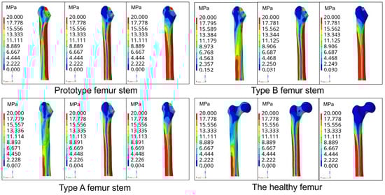 Figure 8 shows that the femur corresponding to the prototype femur has a small amount of stress concentration at the proximal end of the femur. In contrast, the stress distribution of the type A and type B femur stems is more uniform, with less stress concentration. In the one-leg standing state, the high-stress zone of a healthy femur is located in the left region of the bottom of the femur, the middle-stress zone is located in the middle part of the femur and the low-stress zone is located in the proximal end of the femur. In contrast, the high-stress zone of the femur equipped with the prototype femur is mainly distributed on both sides of the femur. The stress distribution of the femur equipped with the type A and type B femur stems showed a gradual decrease from the distal end to the proximal end. The stress distribution is more similar to that of a healthy femur. Under both abduction and adduction conditions, the proximal stress of the femur equipped with the prototype femur is higher than that of the femur equipped with types A and B. In contrast, the stress distribution of the femur equipped with the type A and type B femurs is similar.