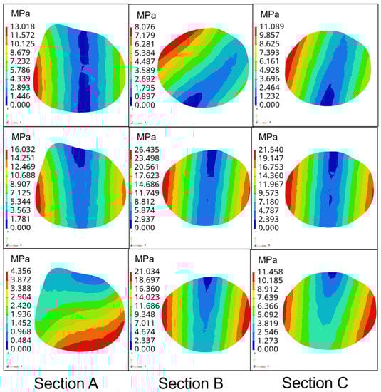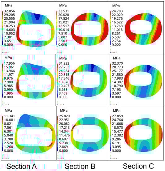 Further, to verify the better biocompatibility of type B femoral stem compared with the femoral stem of the prototype, type A and healthy, the stress magnitude and distribution of three types of femoral stem on three sections of femur under three conditions are proposed under the same boundary conditions, as shown in Figure 9.