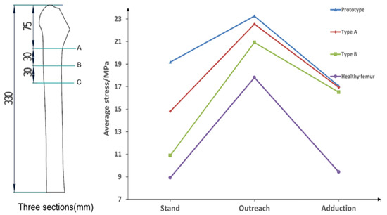 The division of three sections of the femur and the average stress values of sections under three conditions are shown in Table 2 and Figure 10.