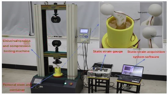 According to ISO7206-4, the CT value of the femoral shaft (the distance from the femoral head bulb to the farthest end of the femoral shaft) is between and and the distance from the upper surface to the femoral head bulb after the embedding medium is solidified should be . Since the connecting wire and the working time of the strain gauge are long in the loading test, the influence of the attachment strain value generated by the resistance strain gauge when the temperature changes on the strain data should be considered. In this regard, the wire temperature compensation formula is given by