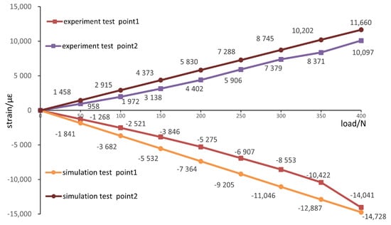 where , and are the cosine of the x, y and z directions, respectively. Finite element analysis is carried out for the loading conditions of 50 N, 100 N, 150 N, 200 N, 250 N, 300 N and 350 N successively and the linear strain values at the test points of numerical simulation are calculated through (17). A comparison with the experimental results is shown in Figure 13.
