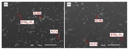 Regardless of the processing procedure, the microstructure of the as-cast samples is composed of α-Mg, β-Mg17Al12, Al2Ca, and Al-Mn rich phases, as observed in our previous work [23]. However, significantly different morphologic characteristics could be observed, which may be attributable to the application of ultrasonic vibrations to the solidifying melt. It is suggested that ultrasound treatment has stimulated the refinement of the intermetallic phases, as previously described [24,25,26]. Indeed, compared to the non-treated sample (Figure 1a), β-Mg17Al12 appeared smaller and more rounded in the US-treated sample (Figure 1b), while Al2Ca was fragmented, exhibiting a script-like disconnected morphology and a more uniform distribution.