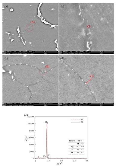 SEM micrographs of the discontinuous β-Mg17Al12 precipitates found in (a,b) non- and (c,d) US-treated samples, after aging at 175 °C for 1440 and 960 min, respectively; (b,d) higher magnification images of areas A and B, respectively, (e) EDS analysis of the particles identified as Z1 and Z2 in (b,d).