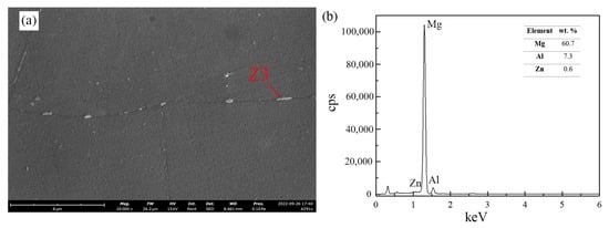 SEM micrograph of β-Mg17Al12 bulk precipitates found at grain boundaries of non-treated material after aging at 175 °C for 1440 min; (b) EDS analysis of the Z3 particle identified in (a).