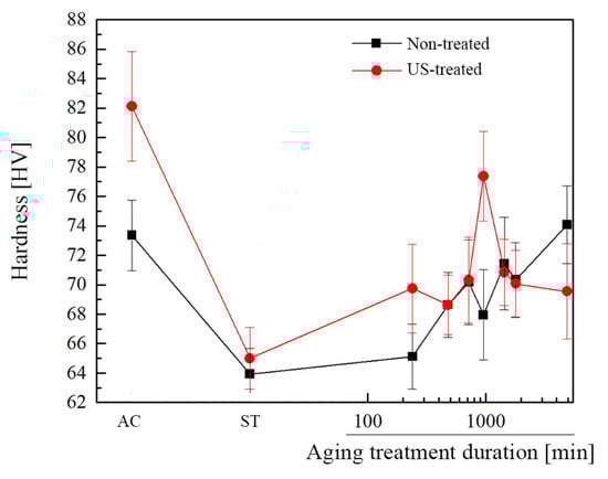 Average Vickers hardness of the non- and US-treated samples during artificial aging.