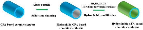 The fabricated CFA-based ceramic membranes exhibit hydrophilic character because of the existence of hydroxyl groups on the membrane surface, and thus it is necessary to apply hydrophobic modification to the hydrophilic membranes for application to MD. In this work, surface grafting modification was applied on M1, M2, M3 and M4 to elaborate hydrophobic membranes via the immersion method from the previous work [30]. The hydrophilic membranes were successively ultrasonically cleaned for 10 min with deionized water and ethanol for the surface pretreatment before the desiccation treatment for 6 h. The pretreated surface membranes were then immersed in pre-prepared ethanol solution of 1H,1H,2H,2H-Perfluorodecyltrichlorosilane with a concentration of 0.2 mol/L for 12 h. After this, the modified membranes were rinsed using deionized water and dried for 12 h and the hydrophobic membranes were obtained. The elaborated hydrophobic membranes were named M5, M6, M7 and M8. The above-mentioned fabrication procedure of the membranes is presented simply in Figure 1.
