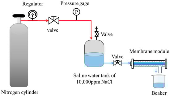 The liquid entry pressure (LEP) of the hydrophobic membranes (M5, M6, M7 and M8) was determined by a test bench using the prepared NaCl solution with concentration of 10,000 ppm. The setup for LEP measurement on the hydrophobic membranes was self-built, as shown in Figure 2. The NaCl solution was pressed into the membrane module by the nitrogen from the cylinder. The regulator was used for adjusting pressure and the pressure gage was used to monitor pressure. The pressure was increased by 1 kPa every time and each pressure was sustained for at least 5 min. Pressure was continuously increased until the solution was collected in the beaker, and the pressure was recorded as the LEP of the membrane at this time.