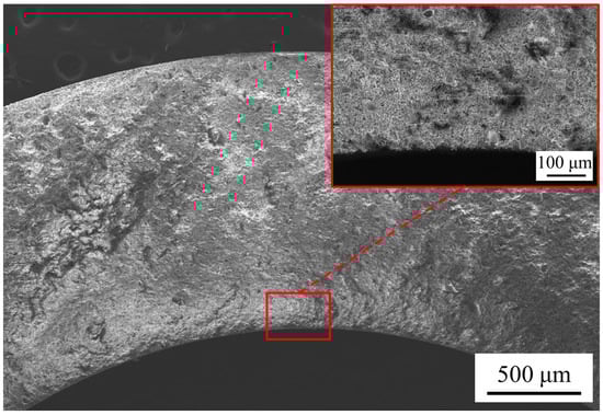 Scanning electron microscopy (SEM) is used to observe the cross-sectional and surface morphology of the membrane in numerous studies on membrane preparation [32,33,34]. In this study, the cross-sectional and inner-surface morphology of the fabricated membranes are determined by SEM. The fabricated membranes were broken into tiny fragments of less than 10 mm in length and width to prepare samples for SEM. The samples were sprayed with platinum for 1 min before the SEM observation. Using M1 as an example, Figure 4 shows the site chosen on the sample when observing the cross-sectional morphology of the membrane. The cross-sectional and inner-surface morphology of the fabricated membranes are shown in Figure 5 and Figure 6. It can be seen from Figure 5d that a thin layer with a thickness of 40 μm is coated on the support of M2, while the layer is much thicker on the support of M3, the thickness of which reaches 100 μm. From Figure 5c, the images present a complete and uniform cross-section of the membranes, which is consistent with the fact that M1 and M4 are the ceramic supports without any coating process of separation layers.