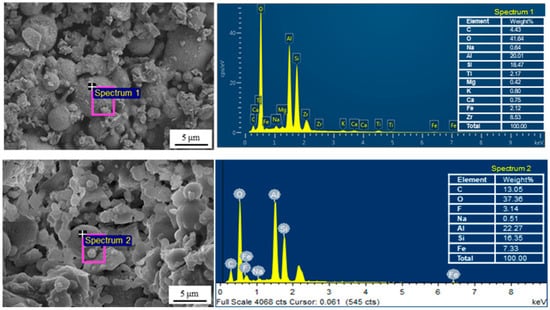 The EDS elemental analysis is conducted on the surface of the hydrophilic CFA-based membrane M1 and the hydrophobic CFA-based membrane M5, and the result is shown in Figure 7. As the hydrophilic CFA-based ceramic support is composed mainly of Al, Si and O, and there is an element F in CFA [29], the high absorption-peak intensity of Al, Si and O in the Spectrum 1 indicates the existence of CFA, and the absorption-peak intensity of element F in Spectrum 2 proves that 1H,1H,2H,2H-Perfluorodecyltrichlorosilane has been successfully grafted onto the surface of the hydrophilic CFA-based membrane.