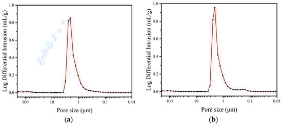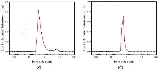 Pore size distribution of the four different membranes via mercury intrusion method. (a) M1; (b) M2; (c) M3; (d) M4.