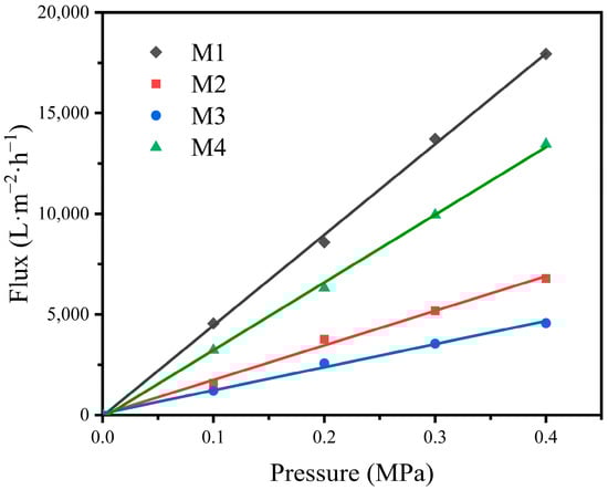 Pure water flux is an important evaluation index of the fabricated hydrophilic membrane performance. The pure water flux through the four different hydrophilic membranes was calculated by the permeate flow rate during the pure water flux measurement and the results are shown in Figure 9. It can be seen from Figure 9 that the slopes of the permeate flow rate versus the transmembrane pressure plots correspond to the pure water flux of the membranes, which is an evaluation index of membrane performance. The pure water flux of M1, M2, M3, M4 is 4550, 1584, 1209, 3225 L·m−2·h−1·bar−1, respectively, which shows a positive correlation with the pore size distribution of the four different membranes. According to the Hagen–Poiseuille equation [37], the pore size is one of the main indexes affecting the pure water flux, and thus the increase in the pore size leads to the rising trend of the pure water flux, which is consistent with the conclusions drawn from Figure 9.