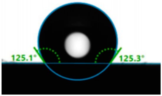 In order to quantitatively analyze the inner surface wettability of the four modified ceramic membranes (M5, M6, M7, M8) used in the VMD process, water contact angles (CA) were test. The water contact angle of M7 is shown in Figure 10. After hydrophobic modification, deionized water formed a stable contact angle of an average of 125.2° on the membrane inner surface. Furthermore, besides M7, water contact angles of the other three hydrophobic membranes (M5, M6, M8) are also shown in Table 2. The results indicate that the water contact angles of the modified membranes are similar, and thus the wettability difference among the four hydrophobic membranes has little effect on their application to the VMD process. Moreover, for the four hydrophilic membranes (M1, M2, M3, M4), water droplets were immediately absorbed when dripped onto the membrane surfaces and the static contact angles of the hydrophilic membranes were 0°. The values of the contact angle for the hydrophobic membranes were in the range of 123–128°, indicating that the hydrophobic modification had successfully changed the hydrophilicity into hydrophobicity for the fabricated membranes.
