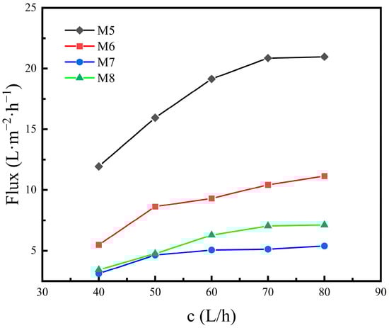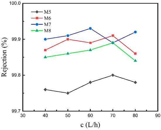 From the curves demonstrated in Figure 12, it can be seen that as the feed flow rate increases, the curves of the salt rejection fluctuate slightly, but the overall curve tendency maintains a nearly horizontal trend; that is, the change in the flow rate has little effect on the salt rejection. For M5, the salt rejection fluctuates in the range of 99.75% to 99.80% when the feed flow rate rises from 40 to 80 L/h, which exhibits a slight change in salt rejection. The changing law of salt rejection with the feed flow rate indicates that the temperature polarization and concentration polarization have little effect on the salt rejection during the MD process.