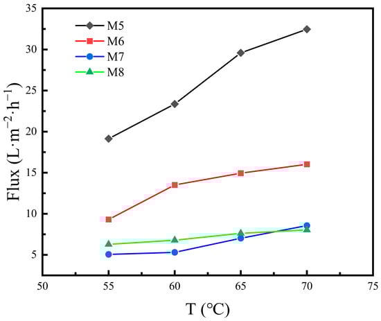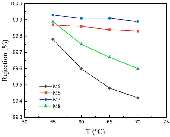 The change in water flux and salt rejection with feed temperature of the four different hydrophobic membranes at the constant feed flow rate of 60 L/h is shown in Figure 13 and Figure 14. As the temperature increases, the water flux of the four membranes increases, because the pressure difference caused by the temperature difference on both sides of the membrane is the driving force of the water vapor transported across the membrane. Therefore, the higher the temperature, the greater the driving force, and the greater the water flux of the membrane. For M5, the water flux increases from 19.14 to 32.46 L·m−2·h−1 when the feed temperature rises from 55 to 70 °C. The improvement in water flux is enormous, which indicates that raising the feed temperature can strongly enhance the water flux during the MD process. However, with the increase in temperature, the salt rejection of the four membranes decreases, because the higher the temperature, the worse the stability of the hydrophobic layer, and the higher the temperature, the more easily the hydrophobic layer is destroyed, resulting in the decrease in hydrophobicity; a small amount of salt solution may permeate the membrane, resulting in the doping of impurity ions in the water recovered by the permeate side, so the salt rejection decreases. For M5 and M8, the tendency of salt rejection to decrease with feed temperature is similarly sharp, as when the feed temperature rises from 55 to 70 °C the salt rejection decreases from 99.78% to 99.42% for M5 and it decreases from 99.89% to 99.6% for M8. However, for M6 and M7, the overall curve tendency maintains a nearly horizontal trend, indicating that the influence of feed temperature is relatively slight on the salt rejection. The different decline tendency of salt rejection among M5, M8 and M6, M7 is likely due to the difference in mean pore size, which is explained by the fact that the smaller mean pore size may alleviate the decline in salt rejection affected by the rise in feed temperature.