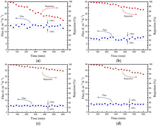In practical applications, not only water flux and salt rejection but also a continuous operating period is critical for a membrane to be applied in waste water or saline water desalination. The continuous operating period of the four hydrophobic membrane is evaluated by performing the VMD experiment for several hours when the feed flow rate is sustained at 60 L/h and the feed temperature is maintained at 55 °C. Each membrane is individually applied to the VMD test and steadily operated for 10 h. The changes in water flux and salt rejection over time of the four different hydrophobic membranes are shown in Figure 15. The average water flux of M5, M6, M7 and M8 is 19.72, 9.54, 5.15, and 6.62 L·m−2·h−1, respectively, and the fluctuation of the water flux is no more than ±10%. The initial salt rejection of M5, M6, M7 and M8 is 99.89%, 99.91%, 99.95%, and 99.93%, respectively, while the final salt rejection of M5, M6, M7 and M8 is 96.23%, 98.36%, 98.72%, and 97.91%, respectively.