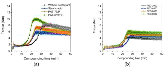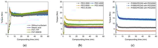 PEG/PMMA systems have been also introduced as a binder in PIM and material extrusion. The influence of three PMMAs with different MW and granule morphology on compounding, melt rheology and micro powder injection molding of zirconia and the final ceramic density was described in [44,46]. A binder, consisting of PEG (MW: 1500 g/mol) and a PMMA emulsion with SA as a surfactant, was used in metal injection molding of tungsten carbide/cobalt mixtures [47]. The liquid debinding behaviour of PEG/PMMA feedstocks in water with Ti6Al4V as a filler and different SA contents is described in [48]. The binder possesses a huge excess of PEG (MW: 4000 g/mol) relative to PMMA of almost 9:1, simplifying the dissolution process [48]. Hayat et al. investigated the influence of the PEG MW (1500–20,000 g/mol) on the flow and water debinding behaviour of titanium-filled PEG/PMMA feedstocks for metal injection molding [49]. The higher the average molecular weight, a higher viscosity and slower solvent debinding in water can be observed [49]. As in the previous case, the influence of the three different surfactants (5 wt%) on the compounding process were investigated; again, the surfactant replaced partially the PEG moiety. Figure 3a presents the torque as function of time and used surfactant (PEG 8000). Due to the huge glass transition temperature of the PMMA (96–109 °C), a compounding temperature of 170 °C was necessary. The compounding curve (Figure 3a) looks quite different than in the PEG/PVB system shown in Figure 2a and can be attributed to the shape of the PMMA pellets and the higher glass transition temperature. Prior to mixing, the pellets have to be liquified, which can be seen in the pronounced extension of the filling and mixing phase up to 30 min instead of 5 min in the PEG/PVB binder. The influence of the surfactants is more obvious; the PAT-659/CB especially caused a significant initial torque increase. After 1 hour compounding time, only the addition of SA delivered a constant torque value. The MW of the used PEGs had only a small impact on the compounding behaviour (Figure 3b). As expected, an increasing MW caused a slight torque increase; the compounding process is more dominated by the pellet melting.