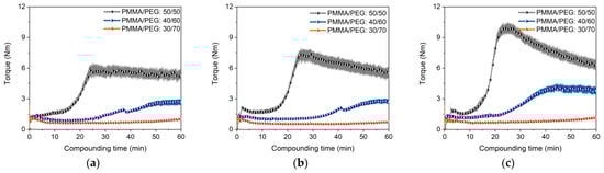 The average molecular weight of the used PEGs had a clear impact on the compounding behaviour. While the equilibrium torque values of the low molecular weight PEG (2000, 4000, 6000, 8000 g/mol) were close together, a further increase to 20,000 g/mol caused almost a torque doubling (Figure 2b). This can be attributed to the increasing probability of chain entanglement accompanied by increasing inner friction. The variation of the PEG/PVB ratio can also be used for viscosity adjustment. Applying PEG 2000 as low molecular weight binder part, the increase of the PEG 2000 fraction yielded a pronounced torque drop and a faster access to the equilibrium state (Figure 2c).
