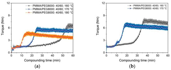 Compounding of PEG/PMMA-based binder and SA as surfactant. (a) PMMA/PEG 8000 ratio 40/60 at different temperatures (solid load 60 vol%); (b) PMMA/PEG 8000 ratio 40/60 at different temperatures (solid load 65 vol%).