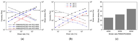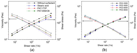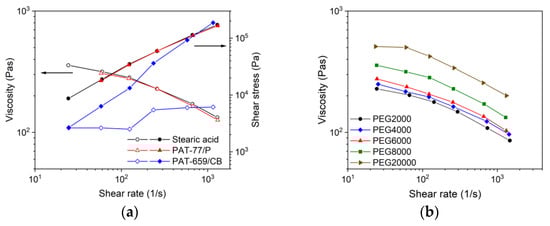 (a) Shear rate dependent melt viscosity as well as shear stress at 160 °C of PEG8000/PVB-based binder at a solid load of 60 vol% and different surfactants; (b) variation of the PEGs’ average molecular weight with 5 wt% SA as surfactant.