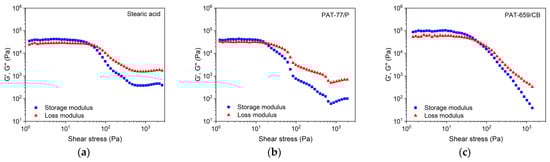 Storage (G’) and loss modulus (G’’) of PEG 8000/PVB systems containing three different surfactants (temperature 160 °C, solid load 60 vol%) via oscillatory test applying amplitude sweep. (a) SA; (b) PAT-77/P; (c) PAT-659/CB.