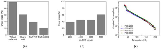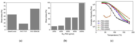 Shear stress values of the yield points for PEG/PMMA feedstocks (160 °C, solid load 60 vol%). (a) Applying PEG 8000 and different surfactants; (b) applying PEGs with different MW and SA as surfactant; (c) complex viscosity as function of temperature and PEG with different MW and SA as surfactant.