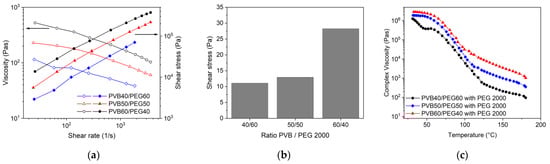 Following the results obtained from compounding, it can be expected that the variation of the PEG/PVB ratio has a pronounced impact on the melt rheology. Figure 9a describes the change of the melt flow as a function of shear rate and PEG2000/PVB ratio. Decreasing PVB amounts allowed a clear viscosity reduction retaining the pseudoplastic flow. The yield point is also affected by the ratio of the low and high molecular binder moiety. Whilst the decrease of a 50%:50% ratio of PEG 2000 to PVB down to 40% PVB has only a small impact on the yield point, the increase up to 60% PVB results in a significant yield point gain by almost a factor of 2.5 (Figure 9b). The variation of the PEG 2000/PVB ratio has an influence on the complex viscosity change with increasing temperature, especially at higher temperatures passing the softening temperatures of PEG 2000 (52 °C) and PVB (68 °C) (Figure 9c).