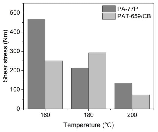 Within the PEG/PVB feedstock composition, it was not possible to realize systems with solid loads beyond 60 vol% in an acceptable quality suitable for FFF or FFD printing. With the experience previously gained by the variation of used PEG, the PEG/PMMA ratio, selected surfactant and exploiting the temperature dependence of the melt viscosity, it was possible to realize feedstocks with an enhanced solid load of 65 vol% by an increase of the PEG 8000 moiety. Figure 13 shows the shear stress values for the yield point applying the two PAT surfactants at different temperatures and a solid load of 65 vol%. The values at 160 °C are significantly higher (almost a factor of 10) than the related ones at a solid load of 60 vol%. In previously described results, e.g., in Figure 11, PAT-77P possessed a higher yield point shear stress value than the PAT-659/CB surfactant; the unexpected behaviour at 180 °C may be attributed to phase separation. It has to be noted that the solid load increase from 60 to 65 vol% hampered the feedstock preparation and measurement significantly.