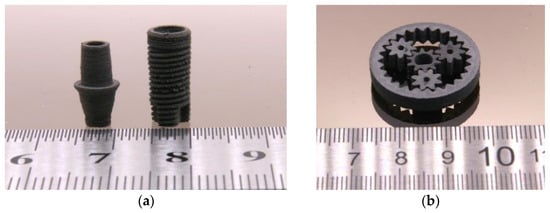 FFF-printed PEG 20,000/PVB parts. (a) Dental implant; (b) planetary gear train.