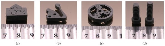 Printed PEG (8000)60/PMMA40 feedstock (solid load 60 vol%). (a) Puzzle (FFF); (b) test structure with long cantilever and holes [18]; (c) planetary gear train (FFF); (d) screws (FFD).