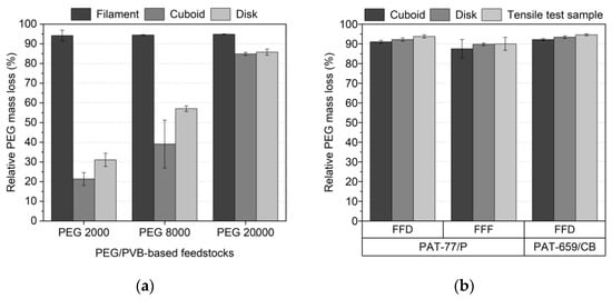 As in the wax/PE-based feedstocks, debinding was undertaken as a two-step process: the liquid pre-debinding (water, 40 °C, 24 h) was followed by a thermal debinding. Figure 16a shows the PEG removal amount for PEG/PVB with different PEG MW (SA as surfactant) and different test samples (filament, cuboid, disk; see Figure 1 in [36]). Quite surprisingly, the filament showed the best PEG elimination in all investigated systems irrespective of the PEG MW. Only in the case of the PEG 20,000 can a comparable removal of the PEG in the filament as well as in the printed specimen be observed. This unusual behaviour was described in the literature [51] and can be attributed to an enhanced thermal instability at elevated temperatures of the low molecular mass PEGs. The printed specimen experienced in contrast to the filament an additional extraordinary heat treatment during printing (extrusion temperature: 90 °C; printing temperature: 230 °C), which caused a PEG decomposition to water-insoluble decomposition products [51]. A further increase of the exposition time (48 h) in water did not show a significant PEG removal improvement. Figure 16b shows the PEG off-take for different printed samples applying the binder PEG(8000)60/PMMA40 with suitable PAT surfactants. In contrast to the PEG/PVB feedstocks, a rapid liquid debinding of all investigated samples and mixtures up to 90% of PEG could be observed. An impact of the huge FFF/FFD printing temperature and resulting PEG decomposition could be found. These results agree with previous investigations [51].