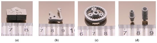 Sintered Ti6Al4V parts (initial solid load: 60 vol%. (a) Puzzle (binder PEG/PMMA); (b) test structure with long cantilever and holes (binder PEG/PMMA); (c) planetary gear train (binder PEG/PVB); (d) dental implants (binder PEG/PVB).