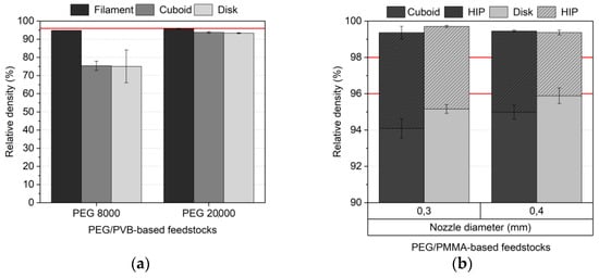 Relative sinter density values (initial solid load 60 vol%) of different FFF-printed test samples: (a) PEG/PVB-based feedstocks; (b) PEG/PMMA-based feedstocks. Additional densification by HIP marked by hatching. Red lines with respect to values described in ASTM F2884-17 [27].