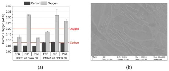 (a) Elemental analysis after sintering and HIP applying different replication methods. The red line represents the maximum allowed values according to [27,52]. (b) SEM image of sintered and additional HIPed microstructure (initial composition: PEG (8000)60/PMMA40, 5 wt% PAT-77P. solid load 60 vol%, FFF printing, density 99.9%).