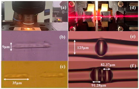 (a) Fabrication system for femtosecond laser scribing; (b) a horizontal short-line structure inscribed in fiber core; (c) two horizontal short-line structures inscribed in fiber core; (d) discharge the short-line area; (e,f) one or two bubbles are formed.