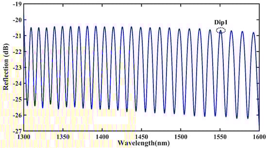 It can be easily seen that the magnification depends only on the cavity lengths of the two cavities, and a vernier effect occurs when their lengths are close but not equal. We can obtain a periodic reflection spectrum, which consists of a series of stripes with different amplitudes. Theoretically, the closer the difference in cavity lengths between the sensing and reference cavities, the larger the amplification factor. However, when the difference between the cavity lengths of the two cavities is too small, the FSR of the envelope becomes too large and the envelope point is outside the wavelength range of the broadband light source, thus, creating adversity in the course of the experiment.