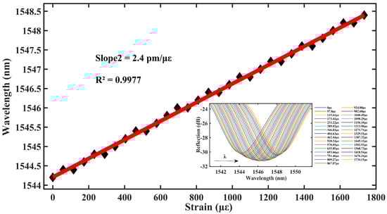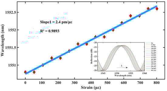 As shown in Figure 5, the central wavelength of the sensor resonance peak dip1 is red-shifted within the axial strain range of 0–802.14 με. The sensitivity of the sensor to axial strain reaches 2.4 pm/με, and the linearity fit reaches 0.9893, thus, exhibiting an excellent linear relationship and high sensitivity.