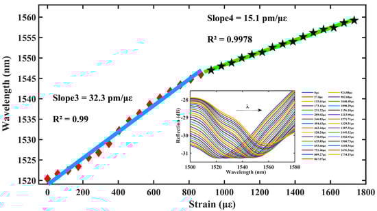 As shown in Figure 7, the red envelope of Figure 3 is used as a drift plot, and the central wavelength of the sensor resonance peak dip3 is continuously red-shifted when the intensity of the axial strain increases. In the axial strain range of 0–867.07 με, the strain sensitivity of the sensor is 32.3 pm/με with a linear fit of 0.99; in the axial strain range from 867.07–1734.15 με, the strain sensitivity of the sensor is 15.1 pm/με with a linear fit of 0.9978.