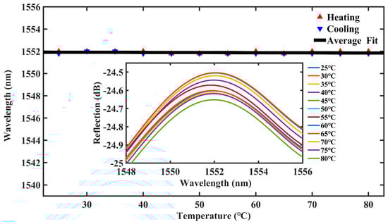 To ensure the repeatability of the sensor, we conducted a temperature reduction experiment in steps of 5 °C from 80 °C to 25 °C. By analyzing the data, we find that the structure’s sensitivity to temperature is also very weak. As shown in Figure 9, it can be seen that the temperature changes from 25 °C to 80 °C have a small effect on the intensity of the spectra. A comprehensive observation of the temperature rise and fall shows that the maximum drift is only 0.05 nm. Therefore, the maximum sensitivity to temperature fluctuations of 0.91 pm/°C can be seen to be almost negligible. The cross effect of temperature could be neglected, additional temperature compensation was no longer needed, and the sensing system could be greatly simplified.