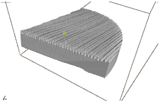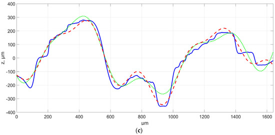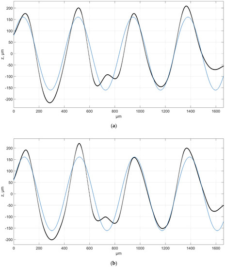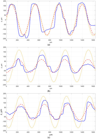 - It cannot be clearly concluded whether the application of more surface modelling functions resulted in better or worse mapping of the model surface. In the case of surfaces described by a single function (compared approximation function and measured profile), the differences in the parameters differed relatively by an average of approximately twenty percent in terms of the amplitude and several percent in terms of the period, for a matching value of 0.7–0.85, depending on the profile, which means a correlation dependence according to J.P. Guildford’s classification. In the case of a surface defined by several periodic functions, these parameters differed by thirty and several percent, respectively, which for a matching of more than 0.95 proves a very clear correlation dependence. Moreover, comparing the profile specified in the CAD model with the profile of the approximating function, there are differences in the accuracy of the fit depending on the printing direction of the sample models. The most favorable variant due to amplitude and periodic differences is to place the models at the smallest possible angle to the building platform: for the assessed samples, it was an angle equal to 20°. In this case, the amplitude differences reached only a few micrometers. A reduction in the surface irregularities mapping quality was observed with increasing building angle (printing direction), which has a negative effect on the building time, layer number, and stair-step effect.