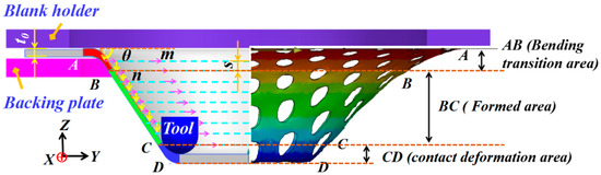 In the SPIF process, the tool squeezed the titanium plate layer-by-layer along the forming contour line (m-direction) to finally form the truncation cone. The vertical distance (n-direction) between each adjacent contour line can be defined as the step-down size s, which is the angle between the deformation plate, and the initial plate can be defined as the wall angle θ. The tool completes the forming motion of contour advance within the layer and vertical downward pressure between layers along the contour trajectory, and the forming principle is shown in Figure 1. According to the deformation characteristics of the material, the main deformation area of the plate is divided into bending transition zone (AB area), formed area (BC area) and contact deformation area (CD area).
