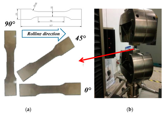 In another study by Li and Wang [46], it was found that the TA1 sheets generally have anisotropic characteristics. To consider the effect of the anisotropic material model on the SPIF process, this paper refers to the literature [47,48,49], and the elastoplastic constitutive equation that meets the Hill 48 (Hill anisotropy yield criterion) can characterize the deformation characteristics of the titanium plate of cold-rolled steel, which is because cold rolling is often assumed to be homogeneous along the same plane of the plate but is anisotropic in the plate thickness. The Hill anisotropy yield criterion was used in the study of the SPIF process. Therefore, in order to establish a reasonable constitutive model of TA1 titanium alloy, the TA1 plate was cut by water jet cutting at an angle of 0 degrees, 45 degrees, and 90 degrees from the rolling direction of the plate to obtain three groups of tensile samples in different directions, and its mean values were taken as the material attribute parameter of the TA1 plate material [50]. The dimensions of the normalized specimens are depicted in Figure 2b. The thickness of the TA1 plate is 1 mm.